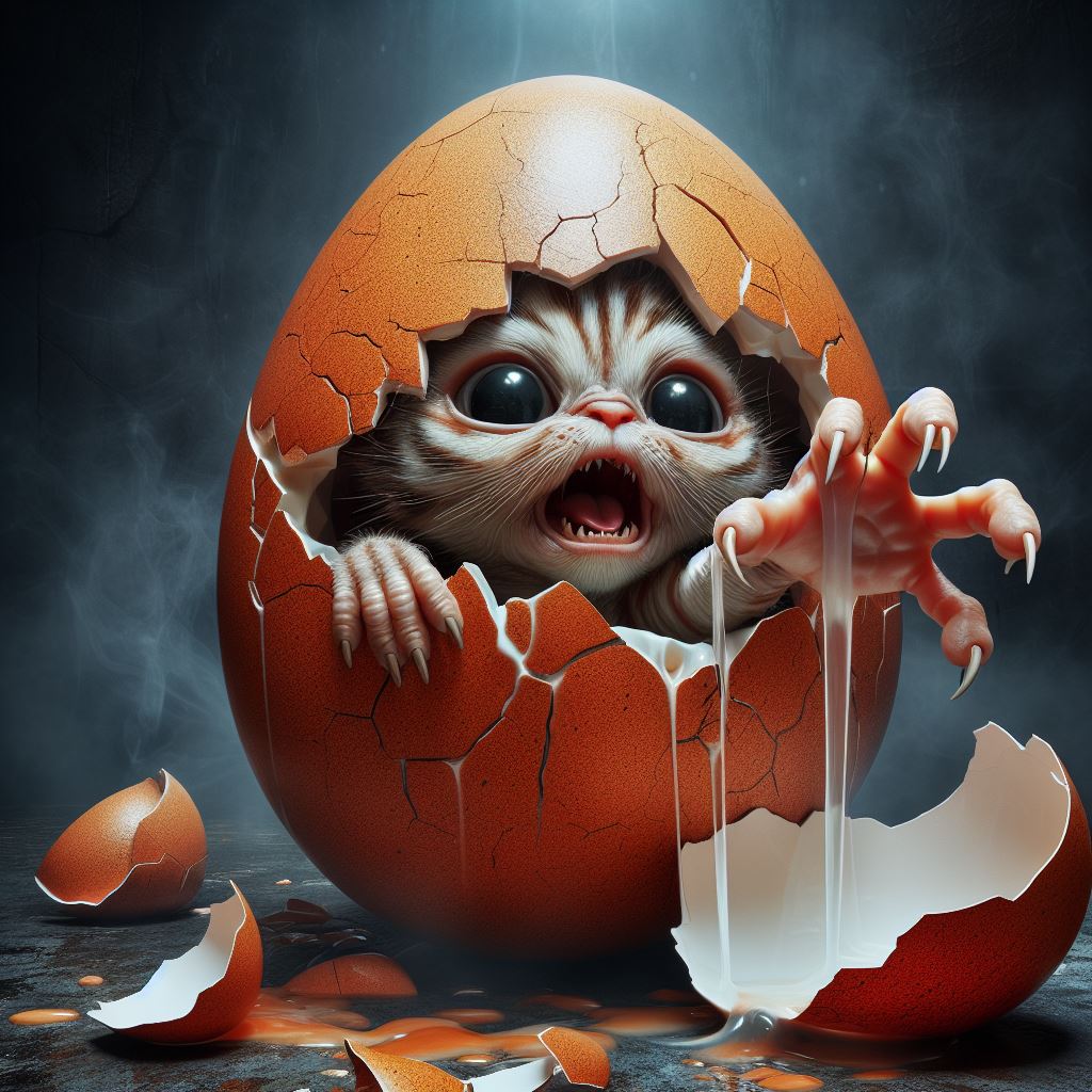Step into a surreal nightmare as a foggy, dimly lit environment sets the stage for an eerie spectacle. In this AI-generated image, a giant egg cracks open, revealing a scene straight out of an HR Giger nightmare. Subtle biomechanical elements reminiscent of Giger's iconic style infuse the unsettling atmosphere, adding layers of horror to the scene. But the true terror comes from the realistically scary sight of a kitten squeezing out of the shattered eggshell. Dark colors dominate the composition, enhancing the sense of foreboding and otherworldliness. Experience the chilling fusion of surrealism and horror in this haunting depiction of the unknown.