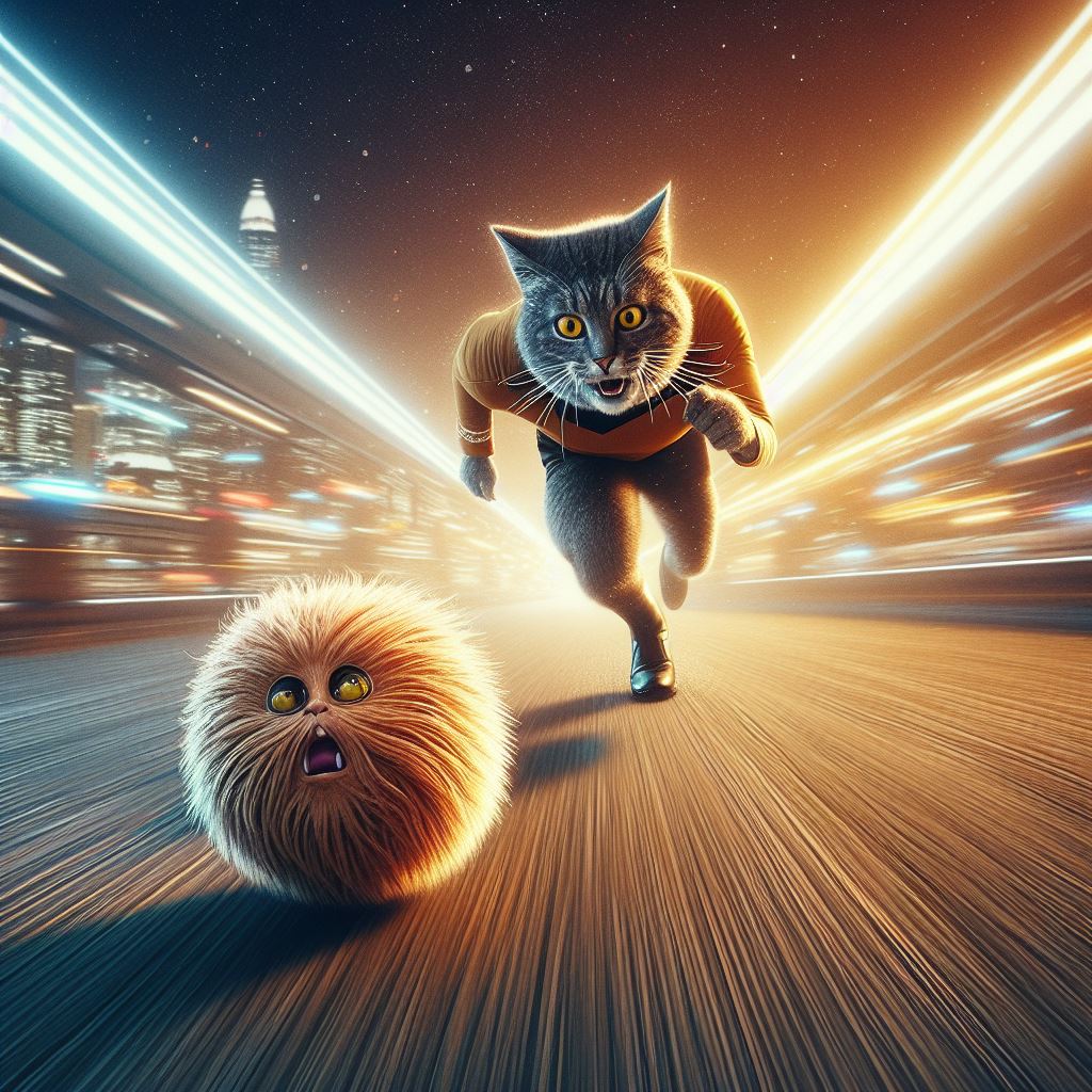 Dive into the heart of an interstellar chase with 'Interstellar Pursuit: Cat vs. Tribble.' This remarkable AI-generated image captures the exhilarating moment as a determined cat dashes after a playful tribble. From the captivating point of view to the meticulously crafted speed effect, every detail in this photo-realistic artwork is meticulously curated, offering viewers an immersive experience akin to witnessing a scene from a blockbuster film.