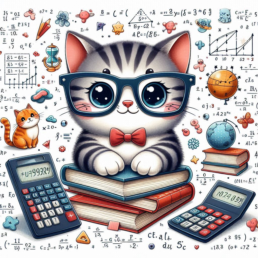 Dive into a whimsical world where feline intellect meets mathematical prowess with our captivating image, "Purr-fect Equations: The Cats of Mathematics." In this delightful scene, a scholarly cat, adorned with glasses, confidently perches atop a stack of math books, its paws poised in contemplation. Adjacent to the books lie two calculators, emblematic of precision and calculation. In the background, a tapestry of mathematical wonders unfolds, with intricate formulas, graphs, and geometric shapes intermingling seamlessly. Amidst this cerebral backdrop, tiny cats frolic, adding a touch of charm to the scene.