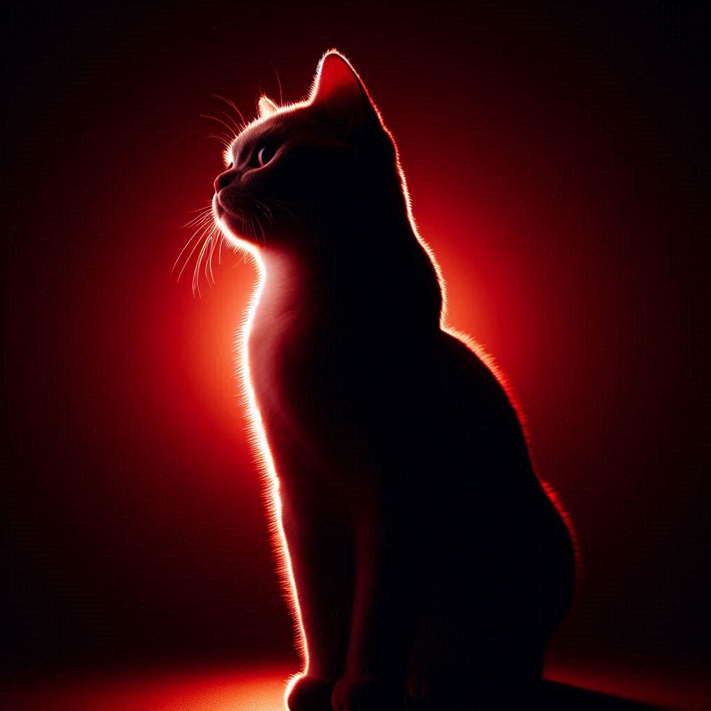 Dive into the mesmerizing world of AI-generated imagery with "Crimson Contemplation," a stunning depiction of a feline's tranquil moment captured in pixels. Illuminated by a vibrant red light cascading from the upper right to the lower left, the cat's silhouette emerges, highlighting its graceful outlines against the deep black backdrop. Standing in a composed and reflective posture, the cat's gaze hints at a world of mystery and contemplation, drawing viewers into its captivating presence.