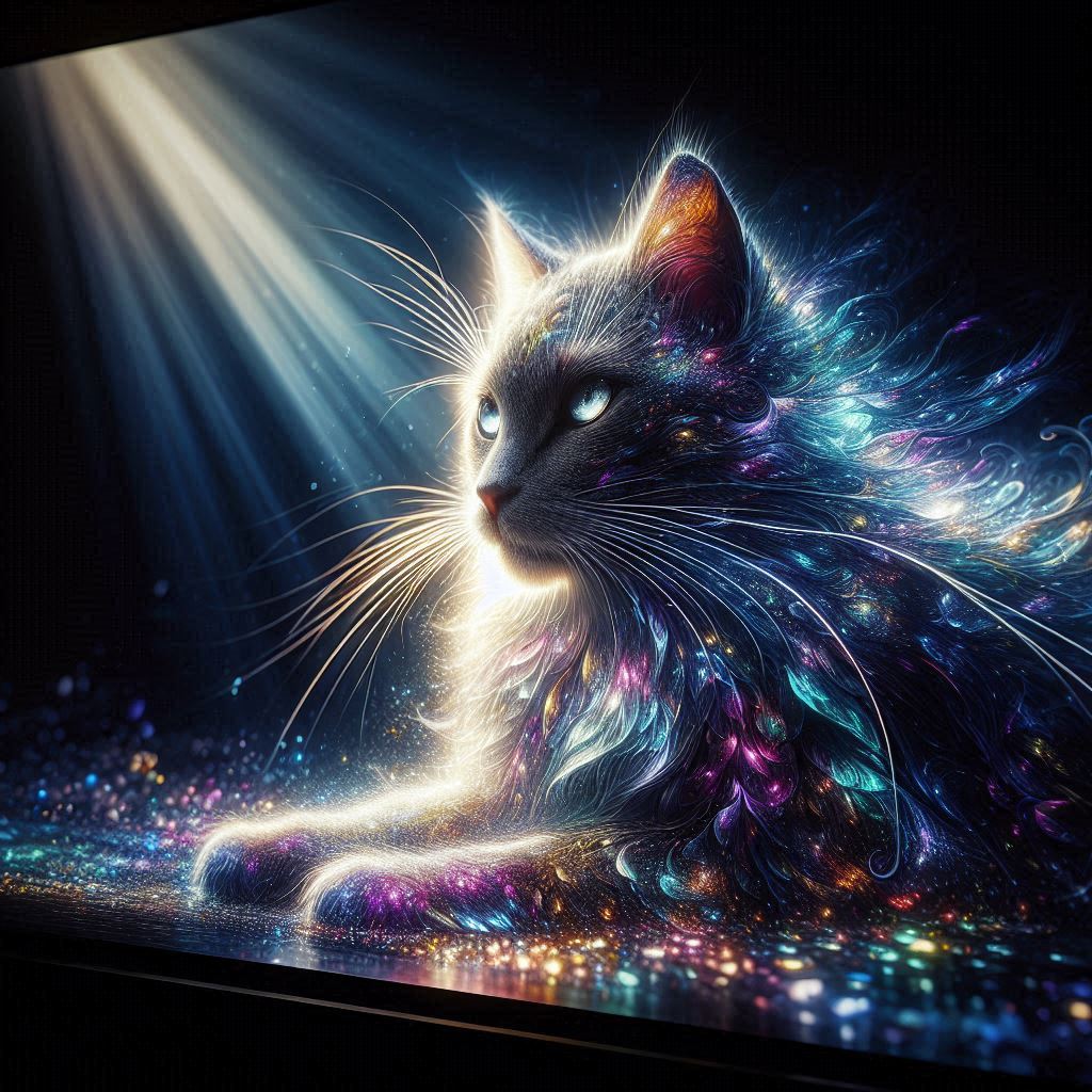 Step into a world where artistry meets nature's splendor with 'Ethereal Feline Majesty,' a breathtaking masterpiece. This mesmerizing image captures a majestic cat in a cinematic close-up, bathed in a spellbinding array of iridescent, luminescent, pearlescent, fluorescent, and phosphorescent light.