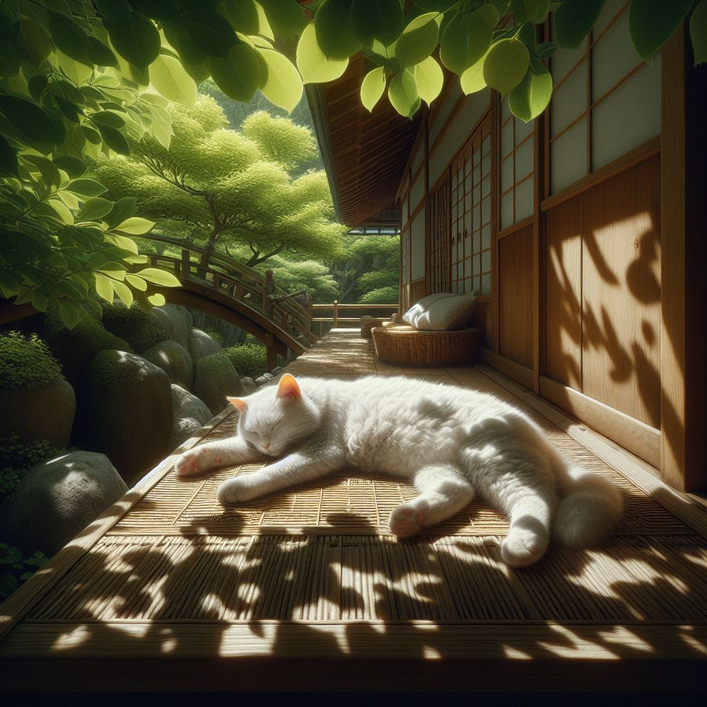 Immerse yourself in a moment of pure serenity with our captivating AI-generated image. Picture this: a warm summer breeze gently sways the leaves, casting a soothing play of light and shadow. Resting peacefully on a traditional Japanese wooden platform, a white cat indulges in a blissful nap, its fur softly illuminated by dappled sunlight. Every detail exudes comfort and harmony, inviting you to unwind and embrace the tranquility of this serene scene. Whether you're a dedicated feline aficionado or simply seeking a moment of calm, let this tranquil image whisk you away to a world of relaxation and contentment.
