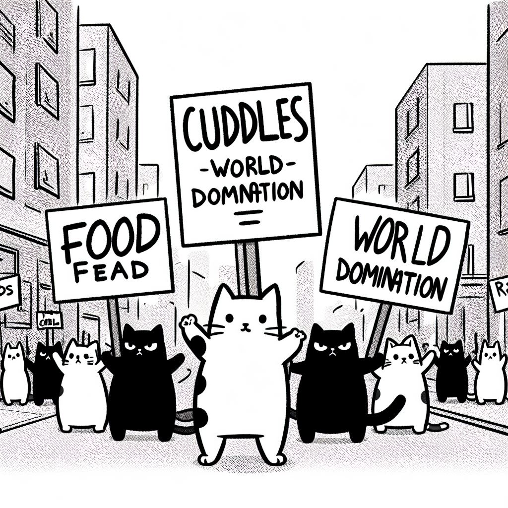 Join the purrtest as a group of determined felines take to the streets in a simplistic black and white cartoon, demanding nothing short of a revolution! These outspoken kitties are on a mission, brandishing banners emblazoned with demands for 'CUDDLES,' 'FOOD,' and even 'WORLD DOMINATION.' With their charmingly rebellious spirit, these cartoon cats are sure to capture your heart and tickle your funny bone. Whether you're a cat lover, an advocate for change, or simply in need of a smile, this AI-generated image is guaranteed to brighten your day. Get ready to witness the cutest protest in town as these feisty felines pave the way for a new era of kitty activism. Don't miss out on this adorable uprising—share the meow-mentous occasion with your friends and let the world know that cats mean business!