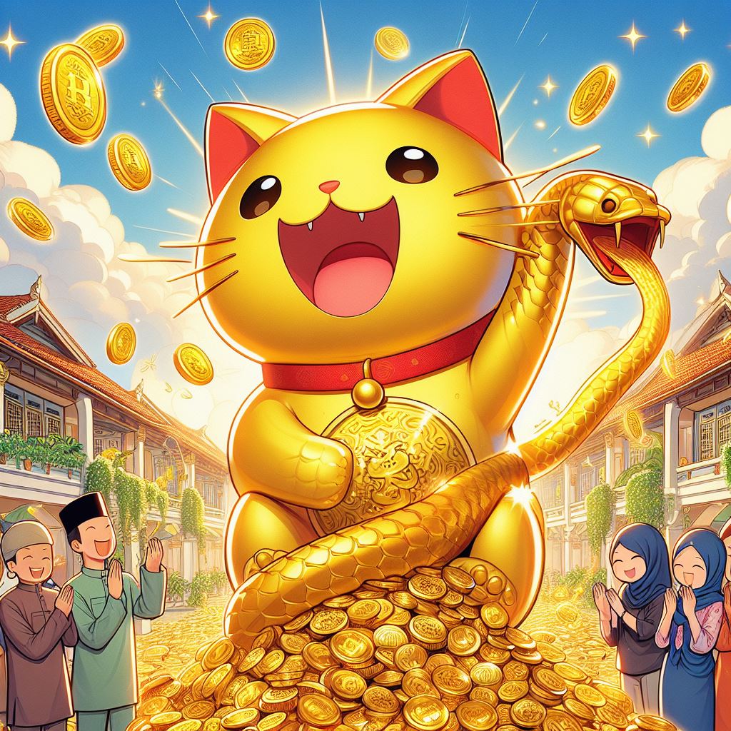 Immerse yourself in the tranquil beauty of Malaysia with this AI-generated image. At its heart lies a golden fortune cat, radiating joy and prosperity, adorned with a peaceful golden snake coiled around its shoulders. As the snake gracefully spouts coins and Malaysian currency—Ringgits—from its mouth, a sense of abundance fills the air. Surrounding them, people from vibrant kampungs gather, their faces filled with awe and reverence for the symbol of fortune and serenity before them.