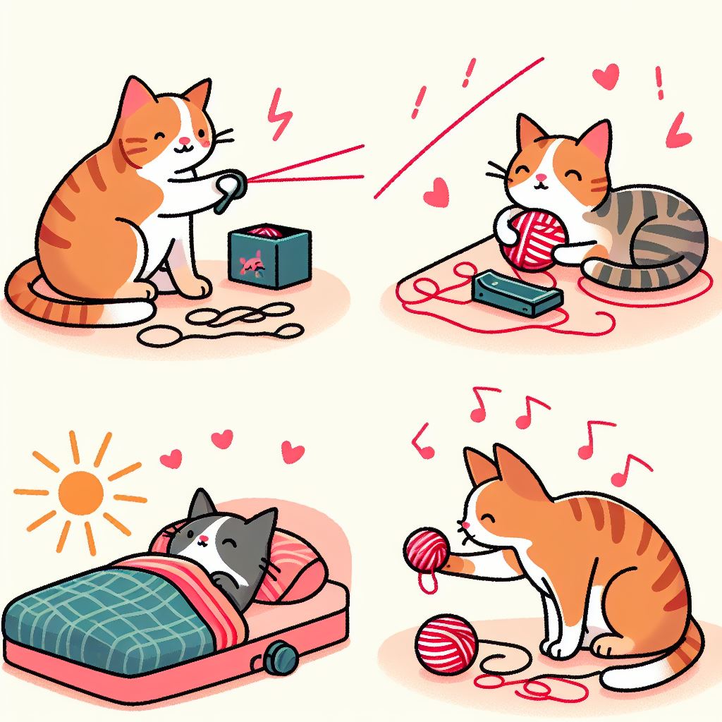 Discover the delightful world of feline fun with this AI-generated image showcasing four charming cats indoors. In this playful and humorous scene, each cat is enjoying a different activity: one eagerly chases a laser pointer, two engage in a spirited game with wool balls, and another indulges in a cozy nap in a soft bed. The image captures the essence of what cats do for fun, highlighting their curious and playful nature. Perfect for cat lovers and anyone looking to add a touch of joy to their day, this image is a testament to the simple pleasures that keep our furry friends entertained. Whether it's the thrill of the chase, the joy of play, or the comfort of rest, these cats embody the essence of feline happiness.