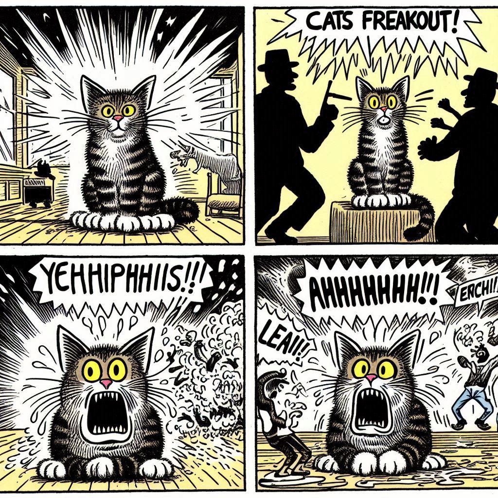 Dive into a four-panel comic strip bursting with humor and chaos, illustrated in the iconic Charlie Hebdo style. This AI-generated masterpiece features a delightful tabby cat who transitions from bliss to bewilderment. In the first panel, the cat is joyfully content, but its tranquility is shattered in the second panel as two men abruptly enter the scene, triggering a "CAT FREAKOUT." The third and fourth panels escalate into a cacophony of screams, with the cat exclaiming "YEHHIPHHIIS!!!" and "AHHHHHHH!!!" as the men join in with "LEAI!!" and "ERCH!!" Rendered in a striking palette of black, white, and light yellow, this comic strip captures the essence of Charlie Hebdo's satirical brilliance, blending expressive emotions and absurdity. Perfect for fans of dark humor and distinctive comic art, this piece is a must-see for anyone looking to add a touch of chaotic hilarity to their day.