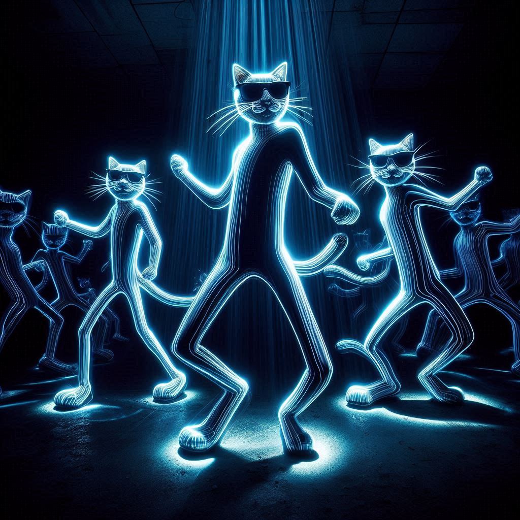 Funky Feline Groove: Long Exposure Light Painting of Cats Dancing Under Blacklight
