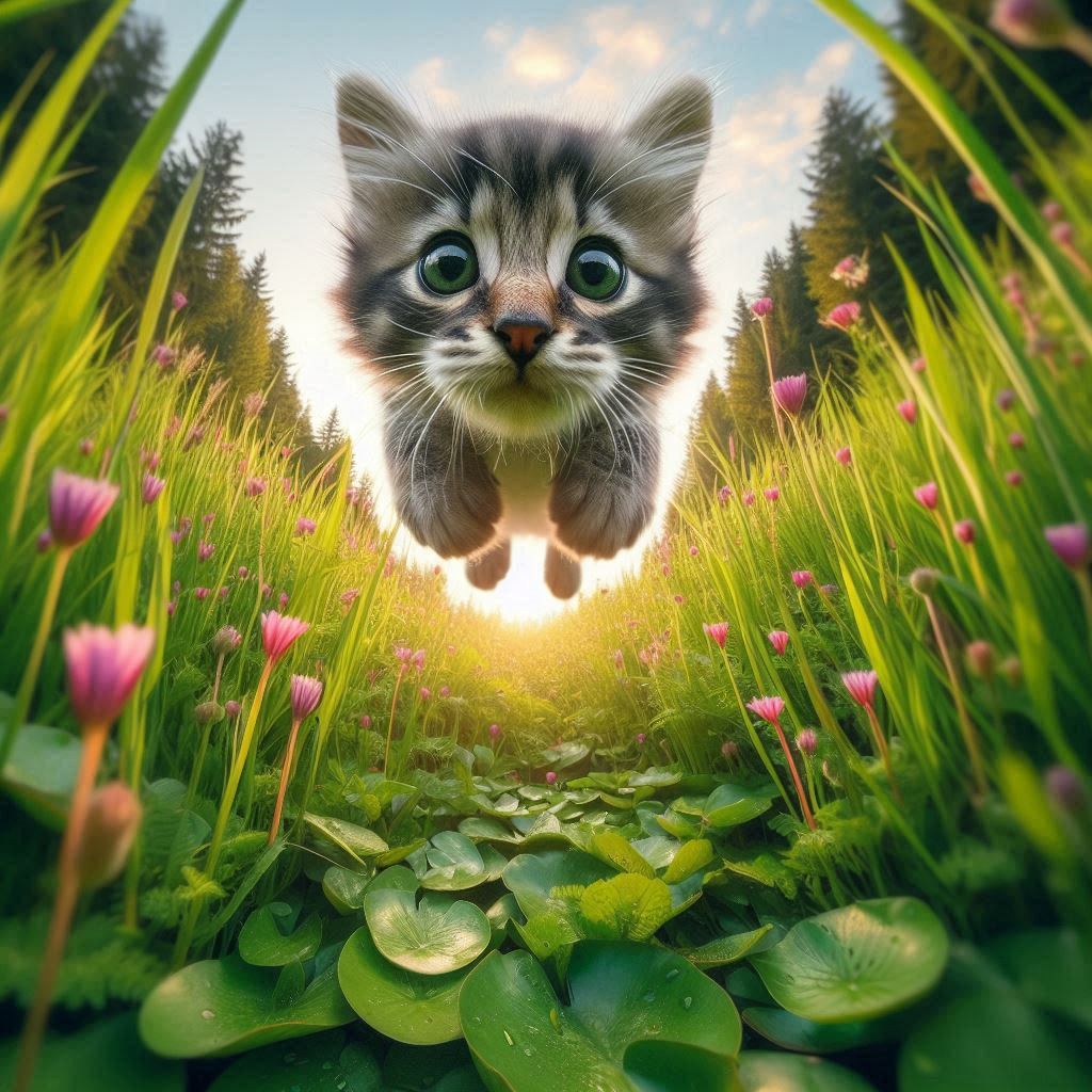Experience the whimsy of nature captured in this stunning photograph of a kitten caught mid-leap, as if frozen in time. The image presents a unique perspective, akin to a frog's eye view, with the vibrant green grass and scattered wildflowers providing a picturesque backdrop. The kitten, with its fur in mid-fluff, displays a moment of sheer delight, leaping towards the viewer with playful abandon.