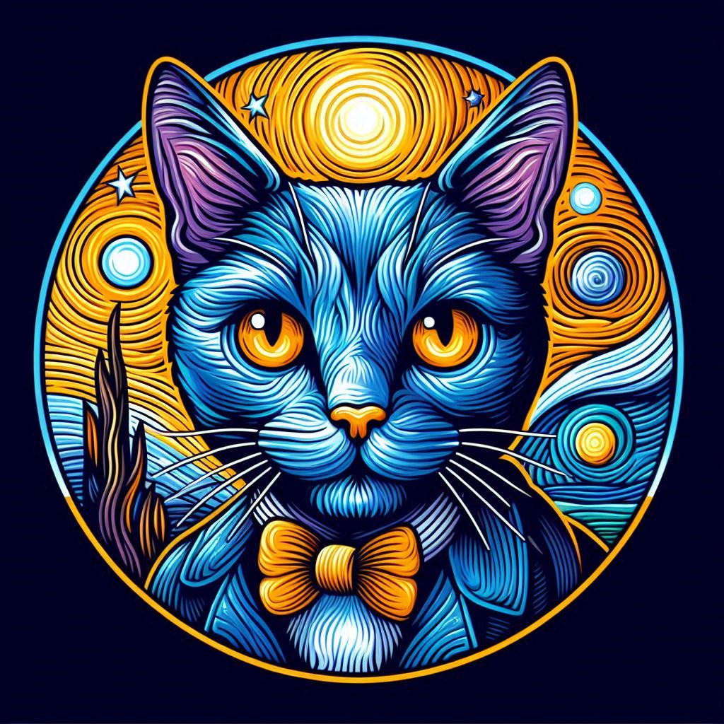 Immerse yourself in the whimsical world of "The Cat of Van Gogh," an AI-generated masterpiece that echoes the iconic artist's style. This digital artwork captivates with its bold use of complementary colors and striking high contrast, reminiscent of Van Gogh's vivid palette and expressive brushstrokes. Created in Corel Draw clipart style, the image blends modern technology with classic artistry, offering a unique visual experience that pays homage to the master's distinctive aesthetic. Perfect for art enthusiasts and cat lovers alike, discover how artificial intelligence brings historical art to life in a contemporary digital format.