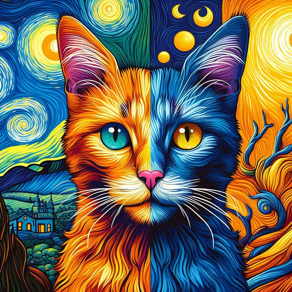 Explore a mesmerizing digital artwork reminiscent of Van Gogh's "The Starry Night," featuring a striking portrait of a cat. This AI-generated masterpiece showcases vibrant orange and blue hues in complementary contrast, capturing the essence of Van Gogh's bold color choices. With clear, defined outlines characteristic of Corel Draw clipart style, the artwork brings a modern twist to classical inspiration. Perfect for art enthusiasts seeking unique interpretations of iconic styles, this piece evokes a sense of whimsy and artistic brilliance, blending traditional elements with contemporary digital art techniques. Discover the charm of "Starry Whiskers" and bring a touch of artistry into your space with this captivating depiction.