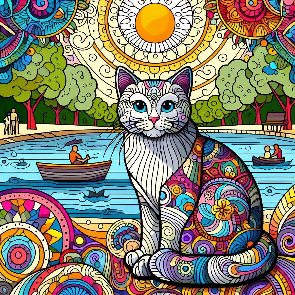 Discover an enchanting AI-generated image featuring a cat amidst vibrant, complementary colors set against a picturesque park backdrop. This artwork, reminiscent of Corel Draw clipart, showcases the cat surrounded by dynamic patterns, creating a striking contrast against the serene lake and lush trees. Ideal for cat lovers and art enthusiasts alike, this digital masterpiece blends creativity with nature, offering a unique blend of whimsy and artistic flair. Perfect for adding a splash of color to your digital projects or home decor, this AI-generated composition captivates with its vivid hues and harmonious design elements. Experience the fusion of technology and artistry in this delightful depiction of a cat in a colorful park, brought to life through advanced AI algorithms and artistic vision.