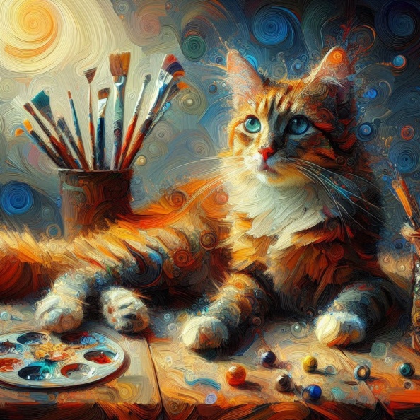 Discover the mysterious beauty of modern art with this highly detailed AI-generated image. A black and white cat sits serenely, gazing at the pale moonlight that casts a gentle yellow hue from the left side of the scene. The moon's glow contrasts with the cool blue hues on the right, creating a striking visual balance. Surrounding the cat, a surreal cityscape disintegrates into intricate curls, filling the sky with a dreamlike texture. The buildings on both sides appear to unravel, blending seamlessly into the night. This captivating artwork evokes a sense of wonder and mystery, making it a perfect piece for those who appreciate contemporary and surreal art. Ideal for adding a dramatic touch to any space, this image is a testament to the endless possibilities of AI in art creation. Explore the fusion of reality and imagination with this unique, modern masterpiece.