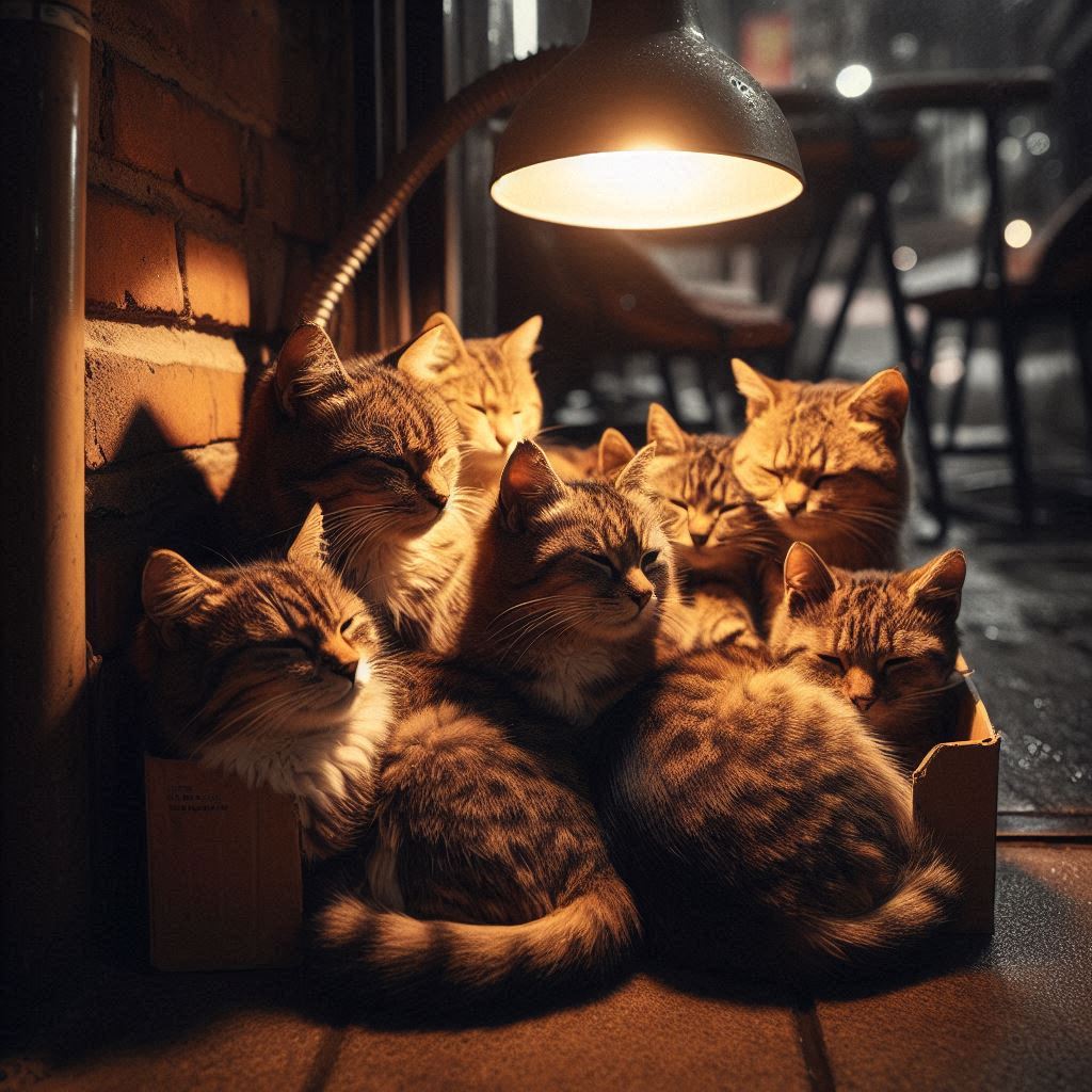 In this heartwarming night scene, multiple stray cats find solace and warmth cuddled together in a box placed in front of a cozy café. Illuminated by a small lamp positioned above the box, these cats are provided with light and warmth, creating a beacon of hope for the strays. The soft glow of the lamp contrasts beautifully with the night sky, highlighting the compassionate gesture of an unknown benefactor who has taken a moment to care for these often-overlooked animals. This image captures the essence of hope and kindness, resonating deeply with cat lovers and advocates for stray animals. It serves as a reminder that even the smallest acts of kindness can make a significant difference in the lives of those in need. Perfect for animal lovers, this touching scene encourages a sense of community and compassion towards stray cats.