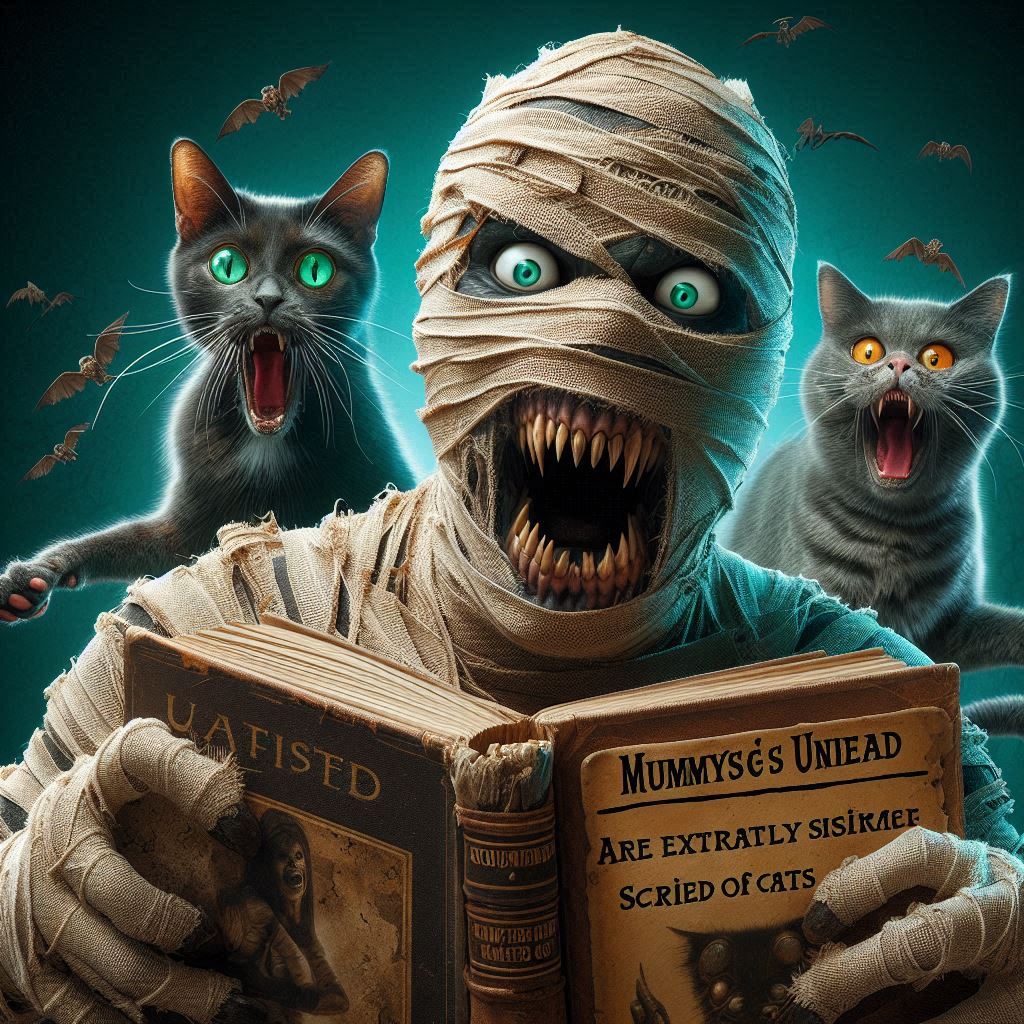 In a whimsical twist on classic horror, this AI-generated image showcases a night scene with a green shimmering sky and bats fluttering above. A single, terrified mummy, with wide bright green eyes and sharp teeth, sits engrossed in a book titled "Mummys undead are extremely scared of cats," filled with humorous spelling errors. The mummy’s dark, cracked skin is visible in several places, adding to its eerie yet comical appearance. Surrounding the mummy, mischievous cats actively work to scare it, their antics highlighting the humorous nature of the scene. The vivid colors and the shining green atmosphere create a captivating and entertaining visual experience, perfect for lovers of light-hearted spooky art. This image brilliantly combines elements of humor and horror, making it a standout piece in the genre of AI-generated artwork.