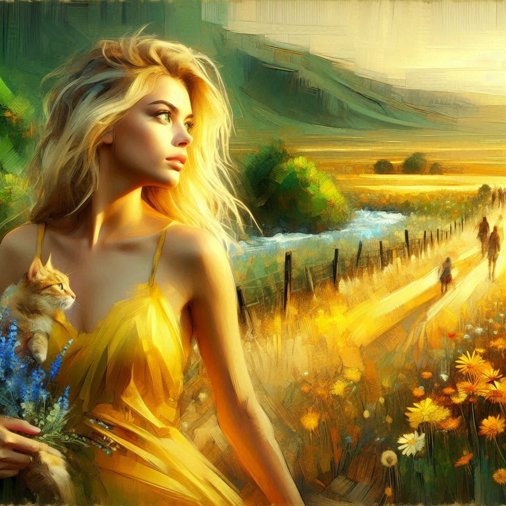 In this serene and captivating AI-generated image, a woman with gleaming blonde hair and striking emerald green eyes flecked with gold stands gracefully amidst a field of yellow wildflowers. Her slim yet strong figure is adorned in a flowing yellow chiffon dress that complements the vibrant landscape. As she walks towards a tranquil stream, she tenderly holds an orange cat close to her heart. The afternoon sun bathes the scene in a warm glow, highlighting the dynamic beauty of the moment. In the background, other figures meander along the winding path, adding depth and context to the peaceful setting. This stunning concept art, ideal for cat lovers, perfectly captures the harmony between human and nature, making it a perfect addition to any collection.