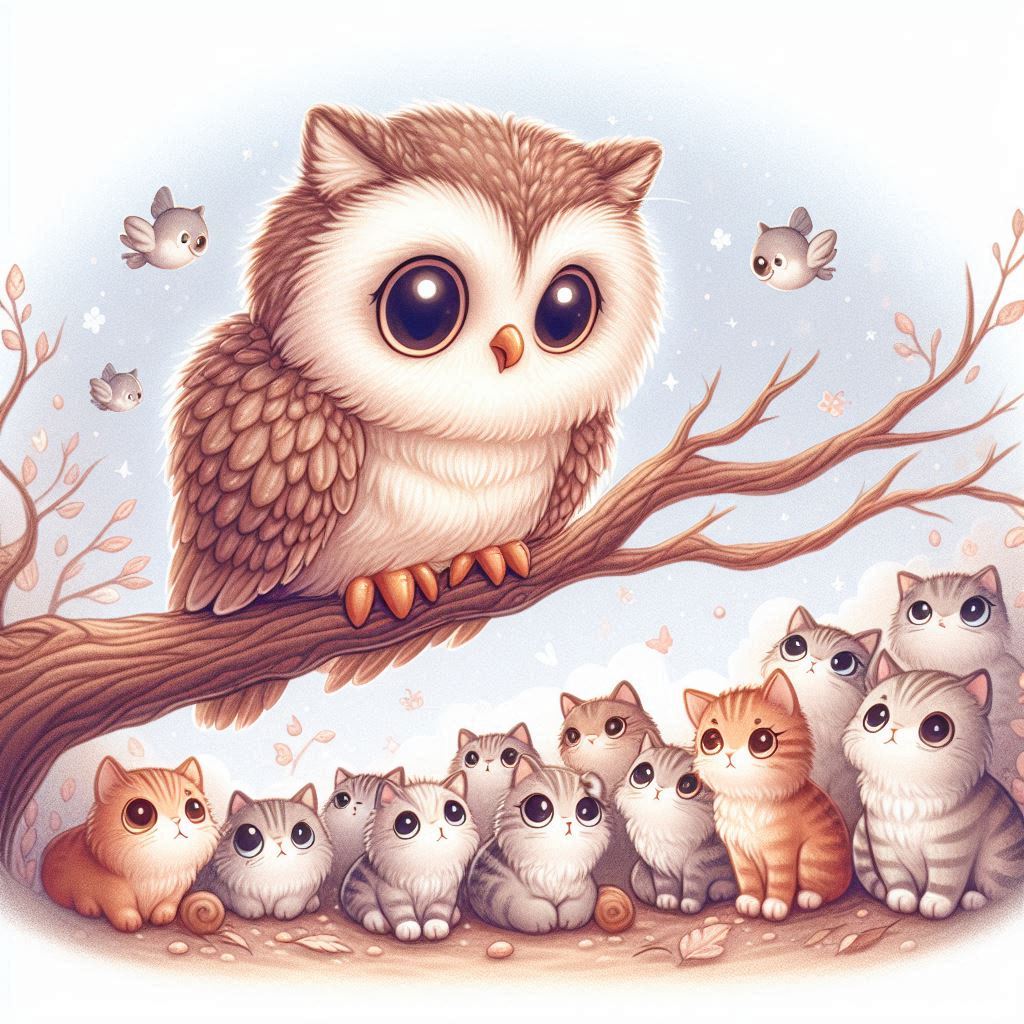Discover the enchanting world of a whimsical forest where an owl, often described as a 'cat with wings,' perches majestically on a tree branch. Below, twelve adorable kittens gaze up with curious expressions, creating a heartwarming and magical scene. This AI-generated cartoonish artwork features light and pale colors, adding to its playful and dreamy atmosphere. Perfect for animal lovers and fans of imaginative art, this image captures the unique charm of nature's wonders. Explore the serene and delightful interaction between the owl and kittens in this captivating forest setting, ideal for adding a touch of whimsy to your digital collection.